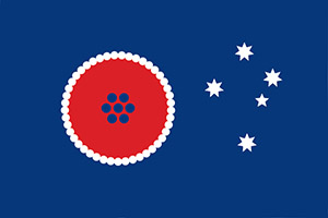 Janet Lucas 2017 - The Big Island flag - a large red disk surrounded by 45 small white discs, with seven blue circles in the centre. A smaller Southern Cross on a blue field provides the element of continuity with the current flag. The red disk symbolises the island-continent of Australia, with the white dots representing the coastline with forty-five hundred inhabited islands. The blue dots represent the states and territories. The use of dots is a nod to Aboriginal dot painting. |